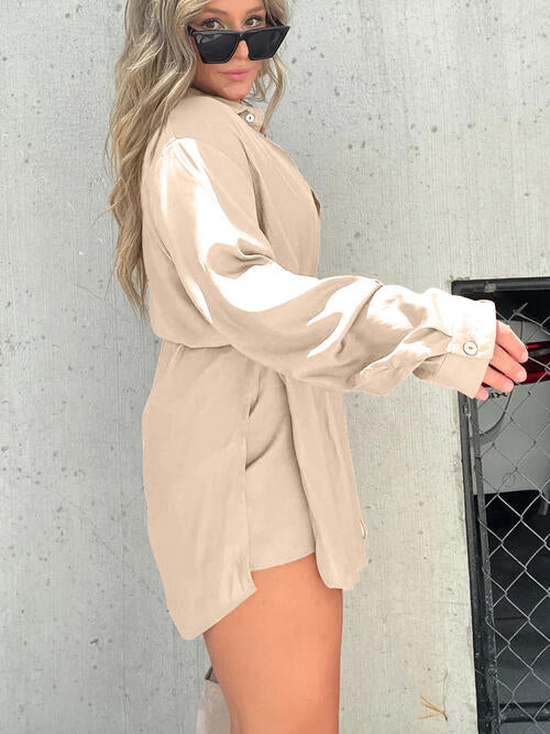 Button Up Long Sleeve Slit Shirt and Shorts Set