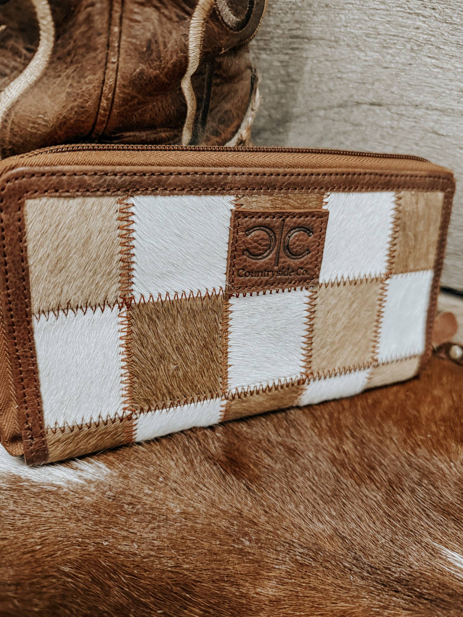 Checkered Cowhide Womens Wallet Wristlet Trendy: Brown