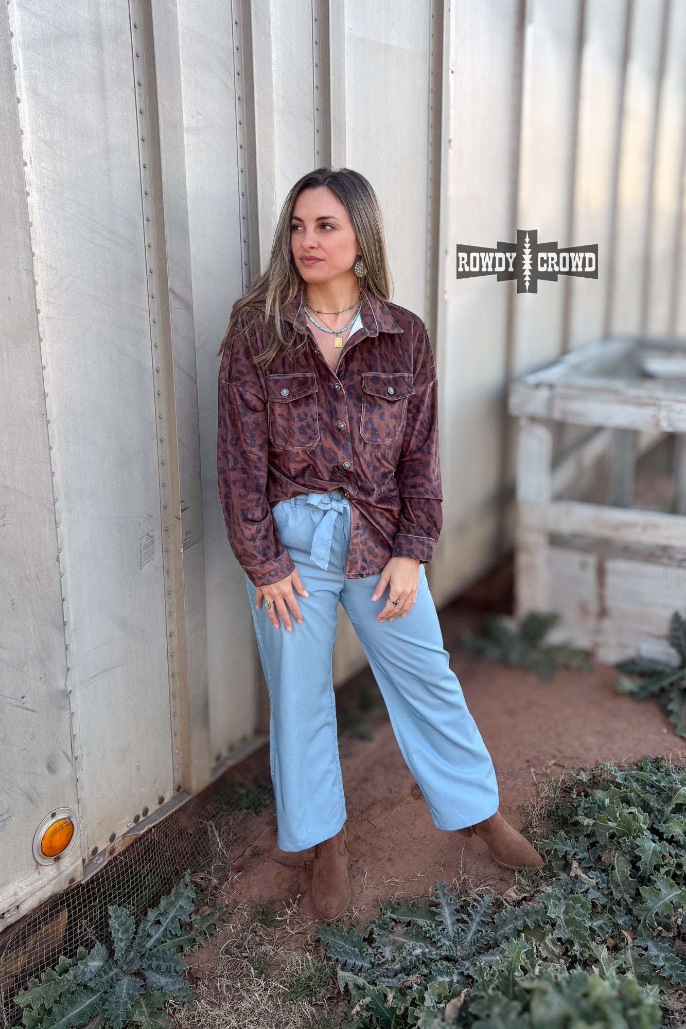 Classic western with a wild twist- the Leopard Lady Button Up is a statement staple. Featuring an allover leopard print on a rich, earthy base, this button up is finished with concho buttons accented with turquoise for that perfect pop of western charm. Designed with chest pockets, contrast stitching, and a relaxed, easy fit, itโs made to wear buttoned up, layered, or thrown on over your favorite tee.